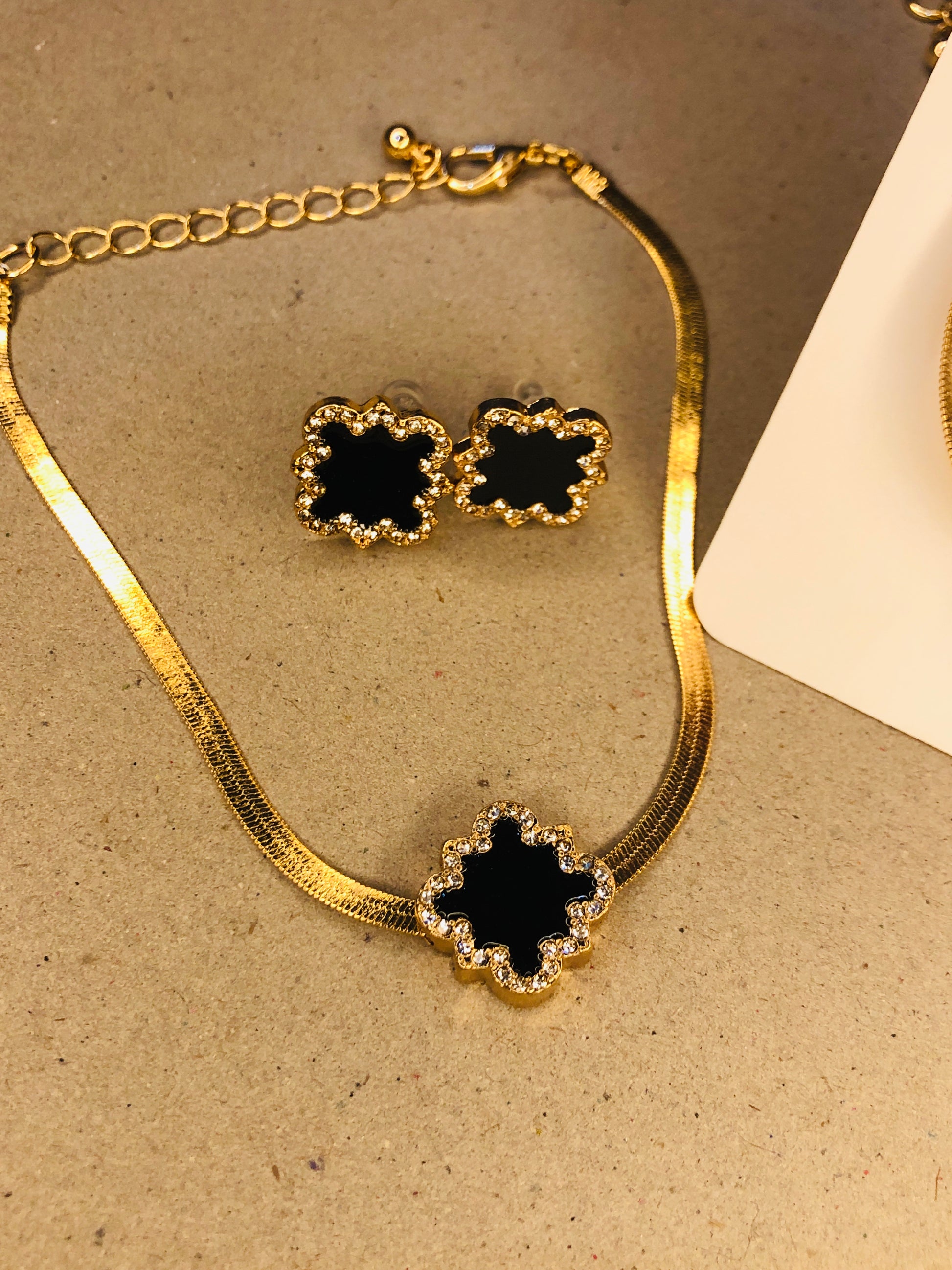Make a bold yet classy statement with our Black Clover 3-Piece Jewelry Set — featuring a matching necklace, bracelet, and earrings. Each piece is designed with a signature black clover charm bordered with shimmering rhinestones, offering just the right touch of sparkle.